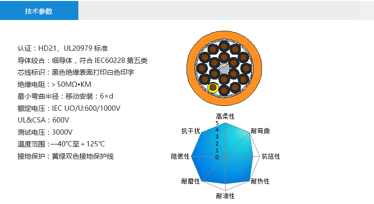 良好的耐折弯,抗扭曲;超高的柔性和使用寿命;可接触各类含矿物油成分的润滑剂、稀释剂、碱水溶液及其他化学介质;具备优异的耐候性、耐磨性、耐油性; 适用于工业机器人;