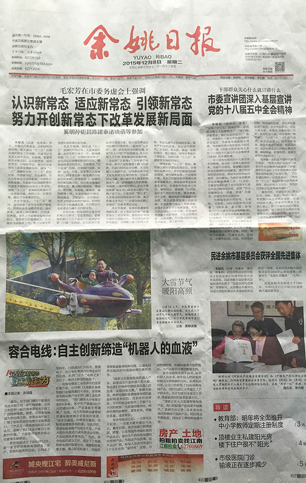 余姚日报:容合电线:自主创新缔造“机器人的血液”
