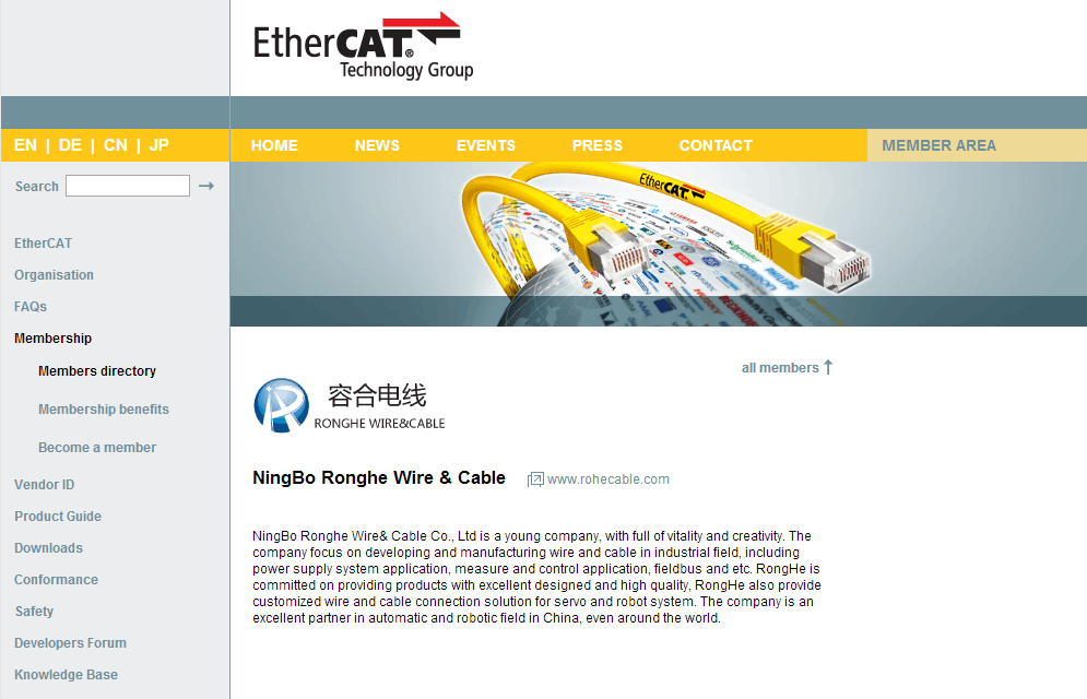 基于公司对于技术的不断投入和精益求精,在经过EtherCAT技术协会严格审核后,在2016年2月,宁波容合电线有限公司成功加入EtherCAT协会。